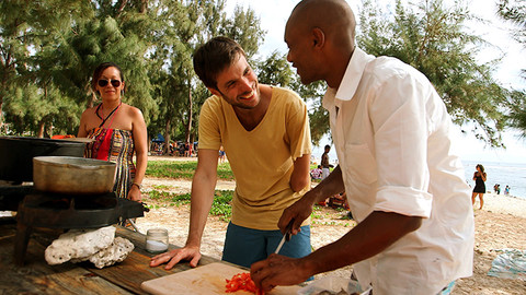 En effet, entre plage et montagne, le cuisinier concocte de la gastronomie réunionnaise aux côtés d'Alexandre, un jeune et talentueux chef local : litchis et ananas gorgés de soleil, rougail saucisse préparé avec amour par la maman du chef, tisanes et curcuma bienfaisants ou larves vivantes ne sont qu'une petite partie des spécialités que Grégory va déguster au cours de son voyage.