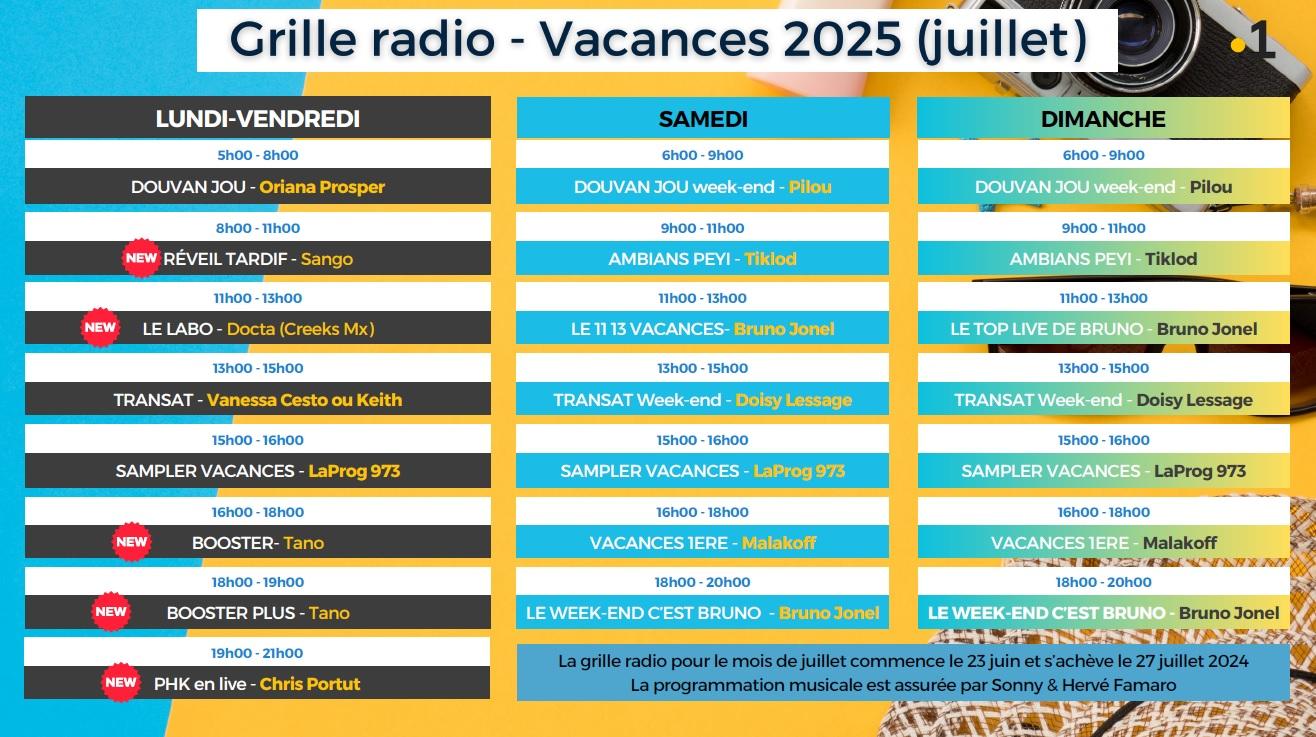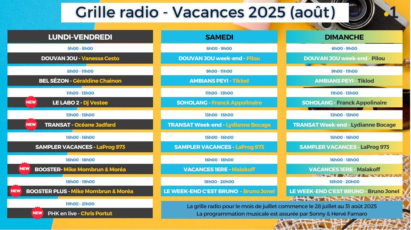 Alors que les grandes vacances débutent, Guyane la 1ère installe une ambiance estivale chaleureuse et conviviale sur ses ondes. Jusqu'au 31 août 2025, la station publique promet d’accompagner les auditeurs avec une grille estivale renouvelée, placée sous le signe de la proximité, de la détente et de la bonne humeur.