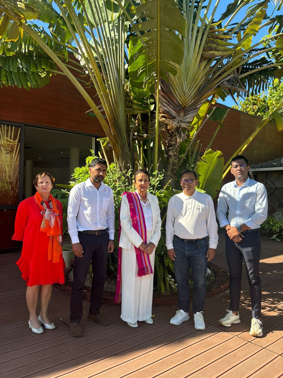La coopération illustrée sous le symbolique arbre du voyageur. De G. à Dr. G. Leveneur, Berthy Ramdoo, Huguette Bello, Joël Randiamandranto, Dany Bravielo