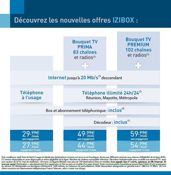 IZI propose désormais 3 forfaits allant d’une offre Internet + téléphone à l’usage au forfait Premium intégrant plus de 100 chaînes et radios et plus de 100 destinations en téléphonie!