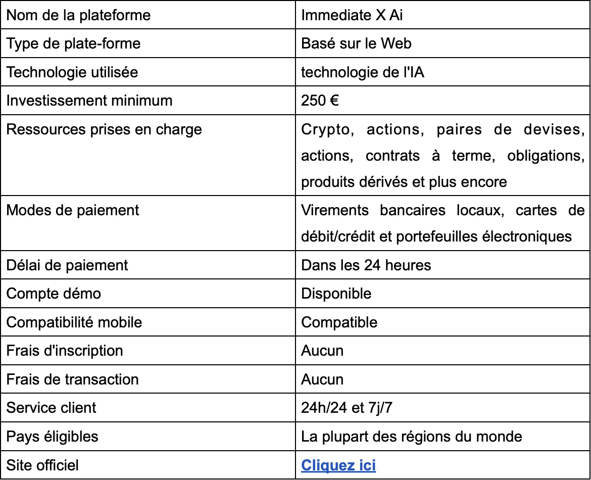Dans cette revue Immediate X Ai, nous avons examiné différents aspects de cette plateforme. Elle utilise les dernières technologies, comme l'intelligence artificielle et des algorithmes sophistiqués pour l'analyse de marché. Le système met en relation les traders avec des courtiers ou des gestionnaires de comptes personnels fiables du secteur. Jusqu'à présent, les retours des traders et des professionnels de la cryptomonnaie ont été positifs.