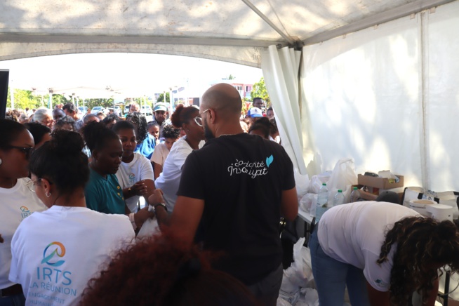 L'ensemble des équipes chargées de la distribution des colis alimentaires_ Insaniyat, le CCAS et la mairie de St-Benoît, les étudiants de l'IRTS de La Réunion