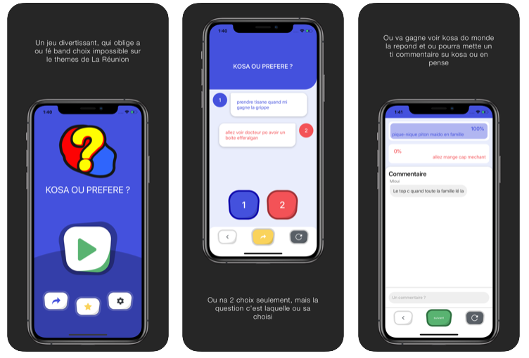 KOSA OU PREFERE ? telle est le dilemme que propose le quiz développé par Hoarau Gérôme a qui l'on doit également les applications QUIZITHEMES ou encore l'agrégateur de contenus INFOACTUS Réunion 974.