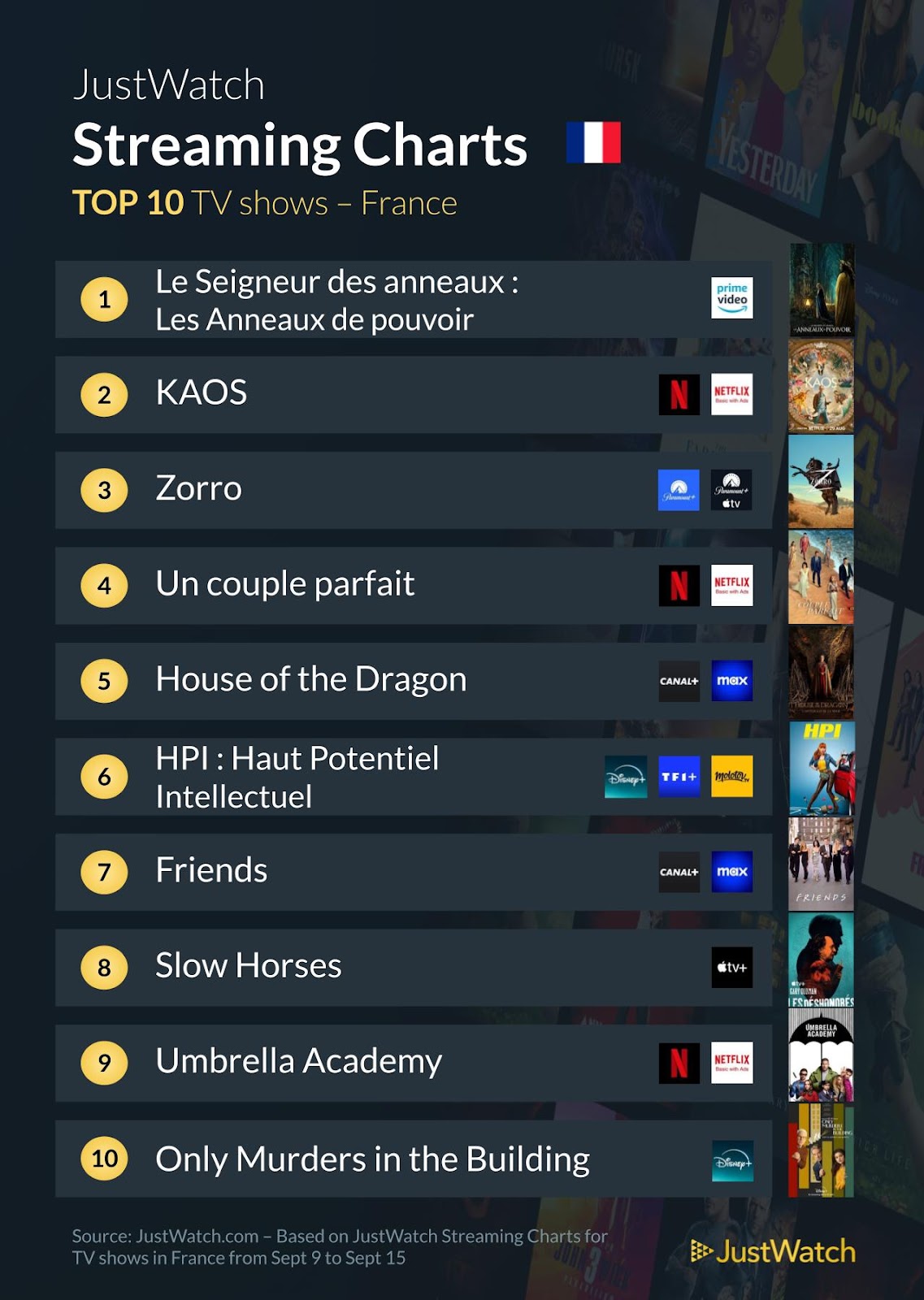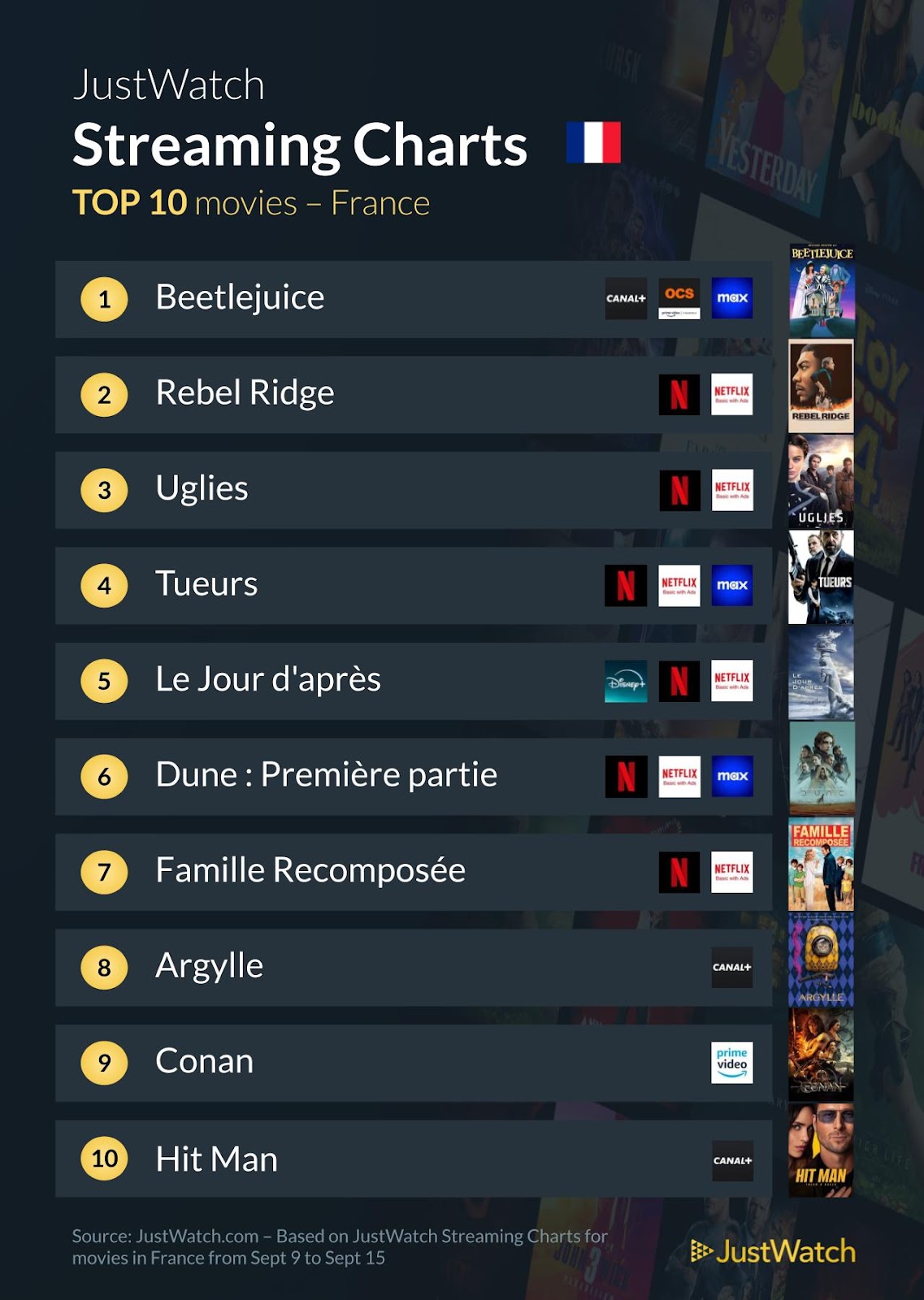 Le site partenaire JustWatch a répertorié les contenus les plus populaires en France sur les différentes plateformes de streaming (Netflix, myCANAL, Prime Video...) du 9 au 15 septembre 2024.