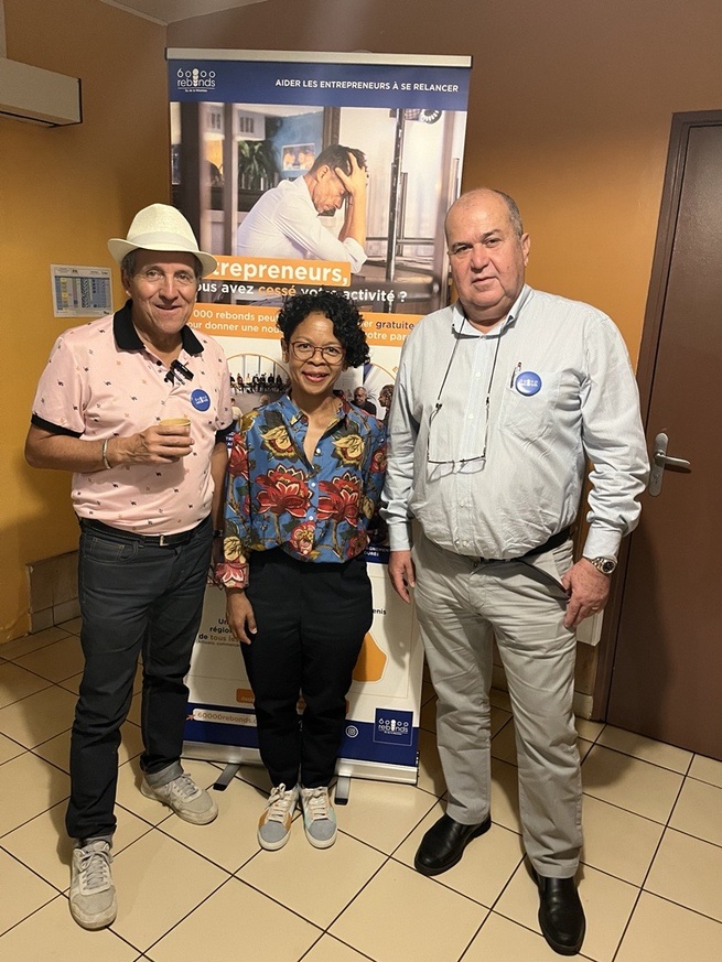 De gauche à droite : Hector Lagos, parrain de l’antenne de la Réunion, Mamy Rabenjamina, entrepreneure ayant été accompagnée par 60 000 rebonds et Sylvio Boyer, référent de l’Île de la Réunion.