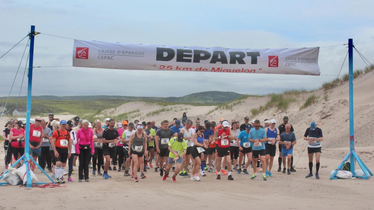 Sur la ligne de départ à Langlade, au sud : des coureurs, des marcheurs, des cyclistes et des adeptes de la marche nordique. Tous prêts à rejoindre le plus rapidement possible la ligne d'arrivée dans la ville de Miquelon, au nord. Qu'ils soient classés comme vétérans, seniors ou jeunes, les participants s'affrontent tous ensemble et par catégorie avec un objectif : finir premier du classement général.