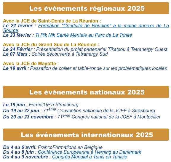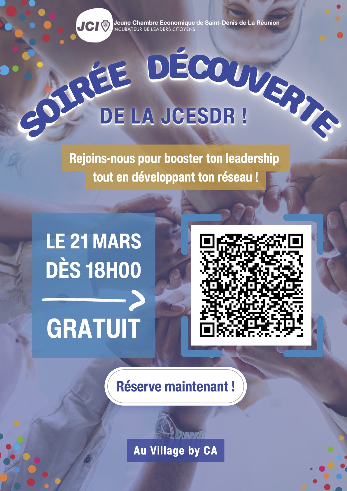 Dans le cadre de sa mission d’incubateur de leaders citoyens, la Jeune Chambre Économique de Saint-Denis (JCE Saint-Denis) invite les jeunes de 18 à 40 ans à participer à sa Soirée Découverte qui se tiendra le vendredi 21 mars 2025 au Village by CA.