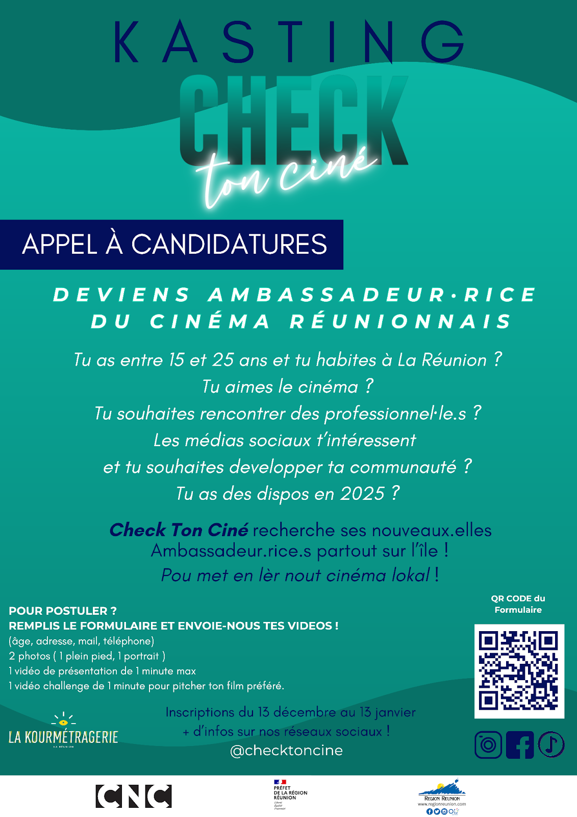 Le programme s’enrichit désormais avec les “Ambassadeur·rice·s Check Ton Ciné”, où des jeunes seront recruté·e·s pour devenir les porte-paroles du cinéma réunionnais auprès de leur génération.