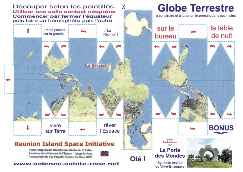 Pour ceux qui sont encore en vacances, après le Festival Réunionnais du Film Spatial, ils pourront faire en imprimant le document ci-dessous, se construire un globe terrestre très agréable à manipuler, qui leur permettra de mieux se situer dans le monde.