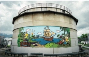 À quelques mètres de l’entrée, une fresque de Jace accueille les visiteurs. L’artiste a reproduit les matières premières indispensables à la production de RIVIÈRE DU MÂT : l’eau des rivières, les champs de canne à sucre, la terre volcanique qui donnent un goût particulier et spécifique aux rhums.