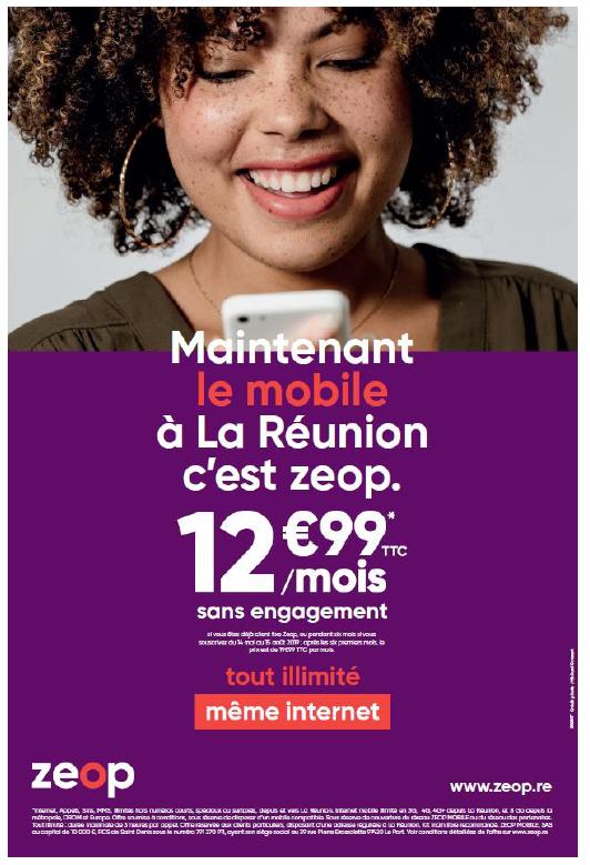 Pour Frédéric LE BOTERVE, directeur général adjoint et directeur commercial, « l’offre mobile de ZEOP est aujourd’hui une offre unique sur le marché français et réunionnais : une offre illimitée en data à 12€99 TTC pour tous, c’est en effet inédit. Nous sommes fiers de récompenser la fidélité de nos abonnés avec cette offre imbattable. Les réunionnais non encore abonnés à la fibre ZEOP (il en reste !) sont aussi très bien lotis : à l’issue de l’offre de lancement à 12€99 pour une durée de 6 mois, le tarif sera de 19€99 par mois, TTC. Cette promotion exceptionnelle de lancement commence le 15 mai et se termine le 15 aout 2019. Mais il leur suffira ensuite de passer à la fibre zeop pour conserver ce tarif de 12€99 ! ».