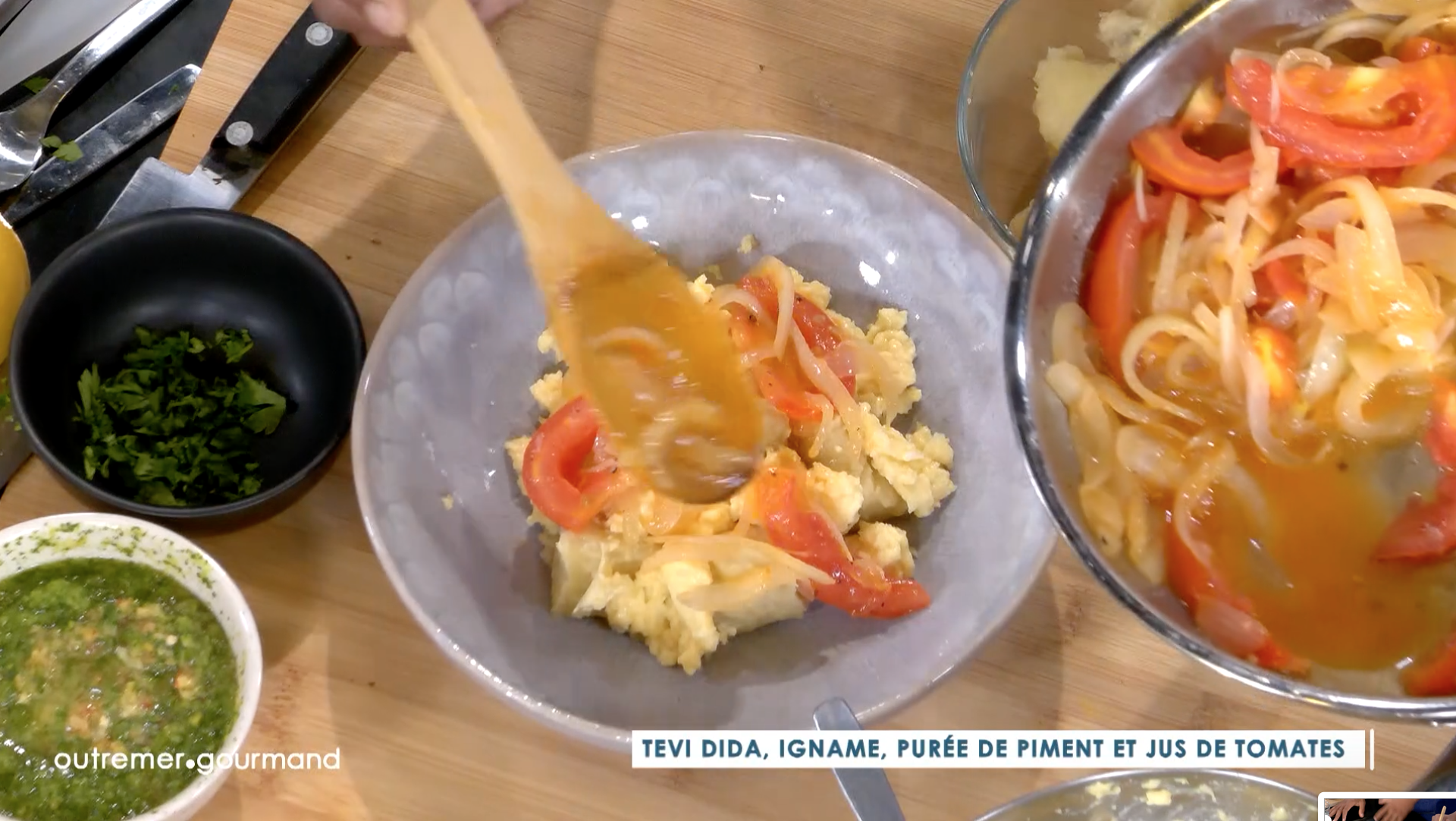Elle nous partage un plat de son enfance au Bénin dont les produits résonnent avec la cuisine des Outre-mer : un tevi dida, de l'igname accompagné d'une purée de piments végétariens et une sauce tomate relevée.