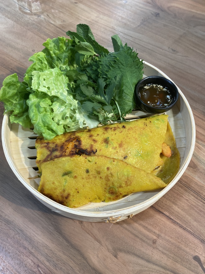 Avec le lait de coco, elle réalise une recette traditionnelle vietnamienne : une crêpe garnie de viande hachée, de crevettes et de légumes !