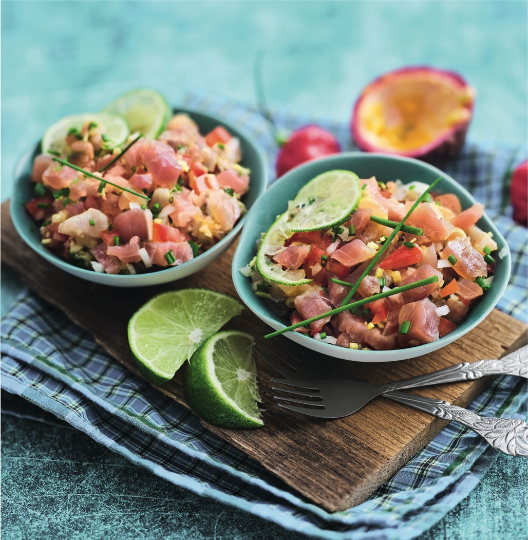 Pour un vrai moment de gourmandise dans l’assiette, savourez ce tartare de thon albacore accompagné de tomates, échalotes, gingembre et ciboulette, nappé d’une sauce passion. Ce tartare bénéficie d’un nutriscore A.