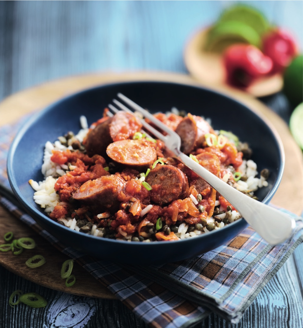Retrouvez toutes les saveurs de la tradition avec ce rougail saucisses. Son riz blanc et ses lentilles, accompagnent ses saucisses légèrement pimentées et fumées au bois de hêtre, cuisinées avec les ingrédients suivants : tomates concassées, oignons, ail, cive, persil, sel, laurier, thym et piment cabri. Les lentilles sont cuisinées avec des oignons, du sel, de la fécule de pomme de terre, du laurier et du thym. A noter : le plat bénéficie d’un nutriscore A !