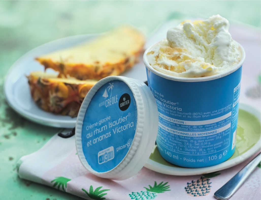 Pour le dessert, fondez pour cette recette aux couleurs de la Réunion avec sa crème glacée au rhum brun Isautier® et ses éclats caramélisés d’ananas Victoria, une recette exquise façon rhum arrangé née de la rencontre entre les équipes Picard et Isautier®.