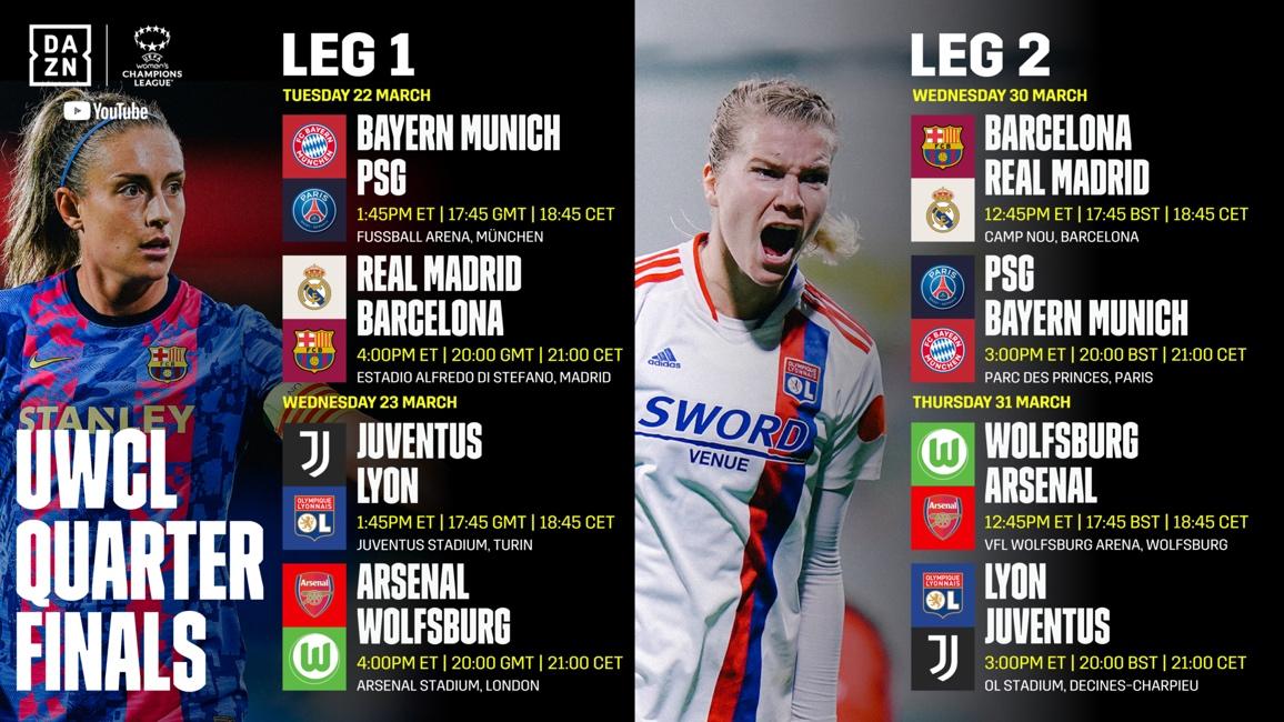 Les matchs des phases finales de l'UEFA Women's Champions League débutent demain, alors que les huit meilleures équipes s'affrontent, en direct sur DAZN et sur la chaîne YouTube de DAZN. Le programme est présenté ci-dessous (toutes les heures sont indiquées en ET) et vous pouvez suivre la saison jusqu'à présent ici.