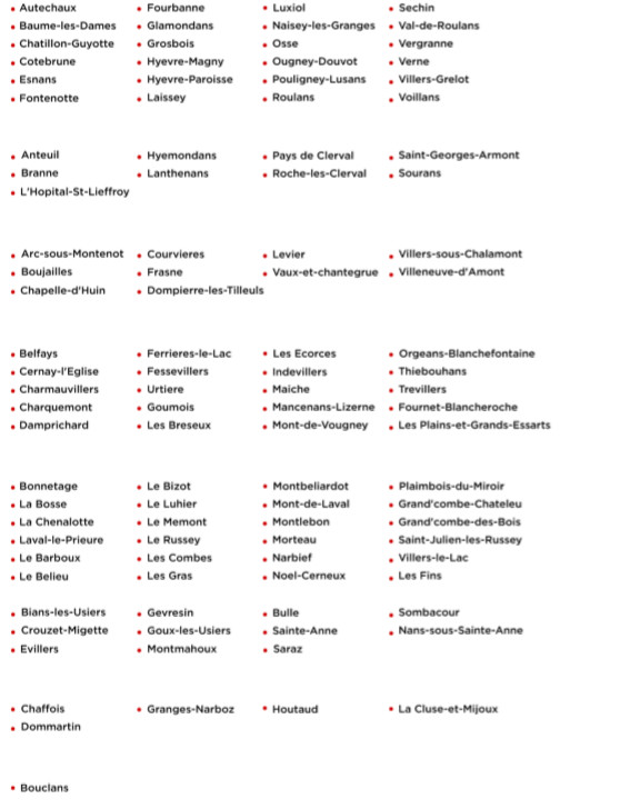Liste des communes déployées par Doubs Très Haut Débit où l’offre Fibre Free est disponible en avril 2019 :