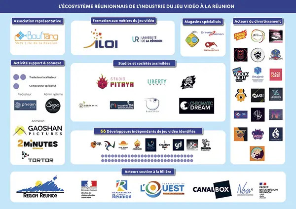 Le Collectif Bouftang en partenariat avec le Territoire de l’Ouest et Canal Box Réunion a mené la première étude sur l’industrie du jeu vidéo à La Réunion. Cette étude a permis de référencer les différents acteurs de l’écosystème, de lister les différents jeux vidéo produits à La Réunion, de comprendre les problématiques des professionnels du secteur et de mettre en exergue des axes pour développer la filière.