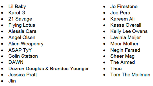 Montez le son de vos haut-parleurs et assistez à des performances inédites de Lil Baby, Karol G, 21 Savage, Flying Lotus, Alessia Cara, Angel Olsen, Joe Pera, DAWN, Moor Mother, Jo Firestone et bien plus encore. Retrouvez la liste complète des invités ci-dessous :