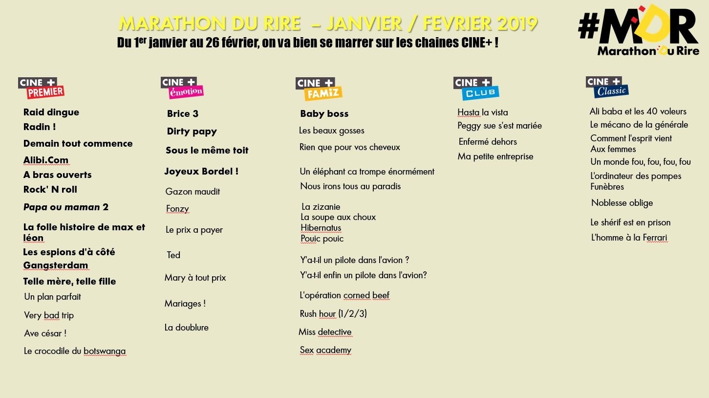 Du 1er janvier au 26 février, Ciné+ à décidé de vous gâter et de vous surprendre avec une sélection de ses meilleures comédies qui seront mises à l'honneur sur l'ensemble des 6 chaines en janvier et février … C'est le MDR 2019 !