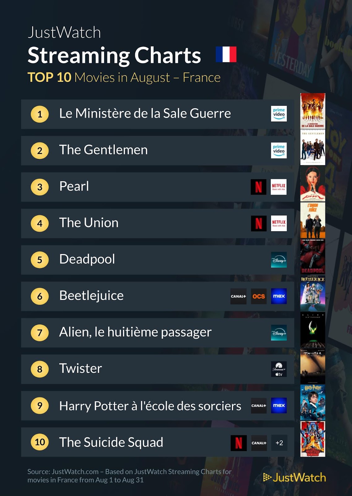 Nous sommes au début du mois de septembre et, comme d'habitude, notre partenaire JustWatch, le plus grand guide de streaming au monde, a publié son classement mensuel des films et séries les plus populaires en streaming en France pour le mois d'août 2024.