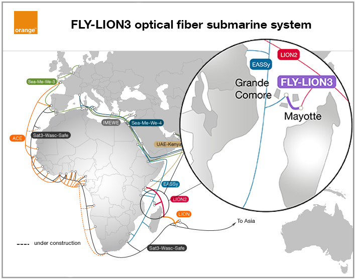 Long de 400 km, le câble FLY-LION3 vient renforcer la connectivité dans l’Océan Indien en ouvrant une nouvelle route pour relier Mayotte à l'Internet mondial et une liaison directe à Grande Comore. Orange Marine, filiale à 100% du groupe Orange est en charge de la pose du câble.