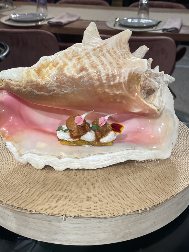 Il nous préparera une assiette de lambi, coquillage star des Antilles, accompagné de bananes pesées. Une délicieuse expression de sa culture caribéenne !