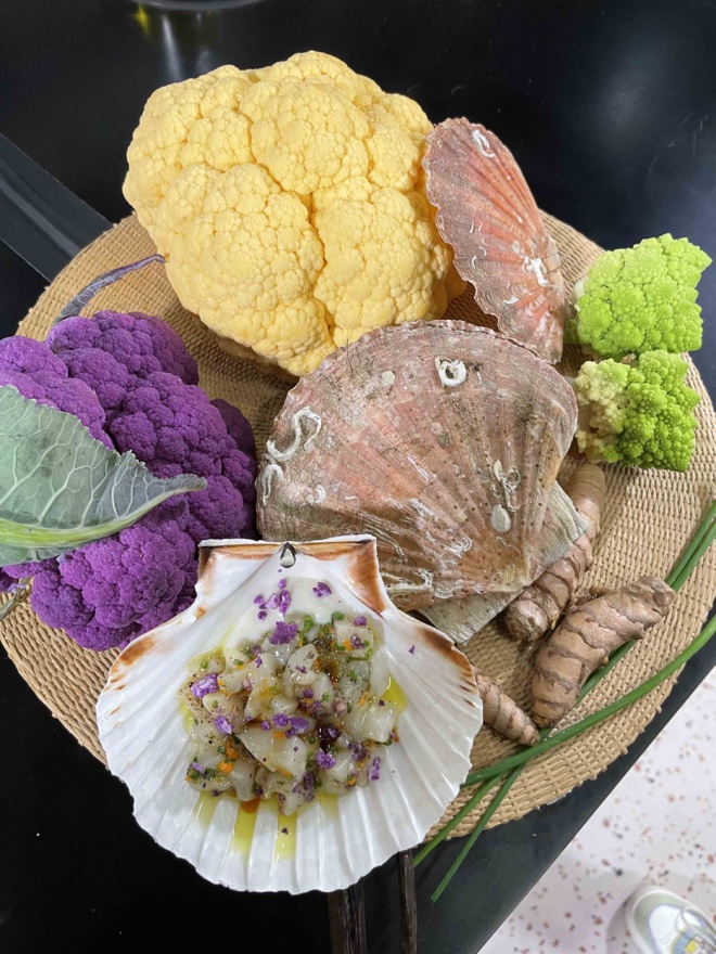 Dans sa recette, il rend hommage à ces territoires qui font partie intégrante de son histoire avec un tartare de Saint-Jacques et chou-fleurs à la vanille.