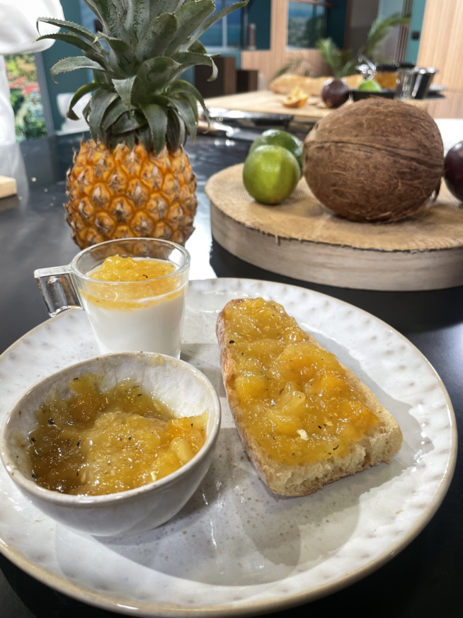 Détenteur des titres de Meilleur Confiturier de France et de Champion du monde de confiture, il nous propose une de ces associations dont il a le secret : Ananas, mangue, coco et passion.