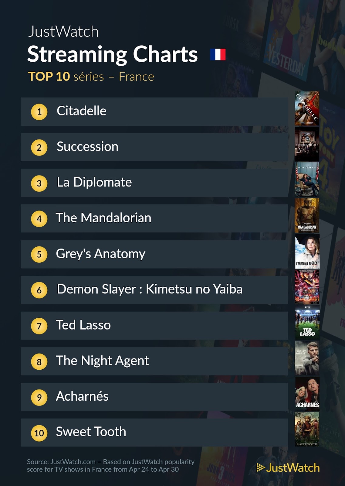 Du côté des séries. On retrouve à la première place, "Citadel", la série phénomène de Prime Video, avec Richard Madden et Priyanka Chopra Jonas. Suit ensuite "Succession", la série HBO (Pass Warner) disponible sur Prime Video, avec Nicholas Braun, Brian Cox, Kieran Culkin, Dagmara Domińczyk ou encore Peter Friedman et enfin à la troisième place on retrouve "La Diplomate", une série Netflix avec Keri Russell (Felicity).
