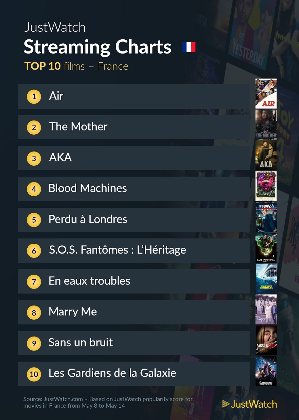 On retrouve "Air", avec Matt Damon, Ben Affleck, Jason Bateman ou encore Marlon Wayans à la première place, actuellement disponible sur Prime Video. Suit ensuite le film "The Mother" avec Jennifer Lopez, trouvable sur Netflix et sur la dernière marche du podium on retrouve "AKA" avec Alban Lenoir, Éric Cantona, accessible sur Netflix.