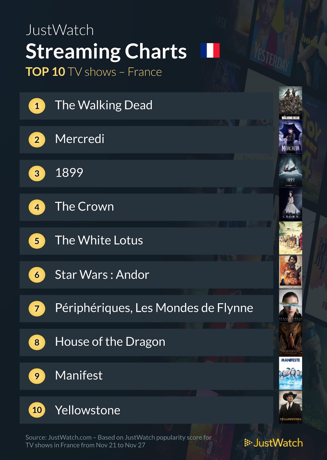 Le site partenaire JustWatch a répertorié les contenus les plus regardés en France sur les différentes plateformes de streaming (Netflix, myCANAL, Prime Video...) du 21 au 27 novembre.