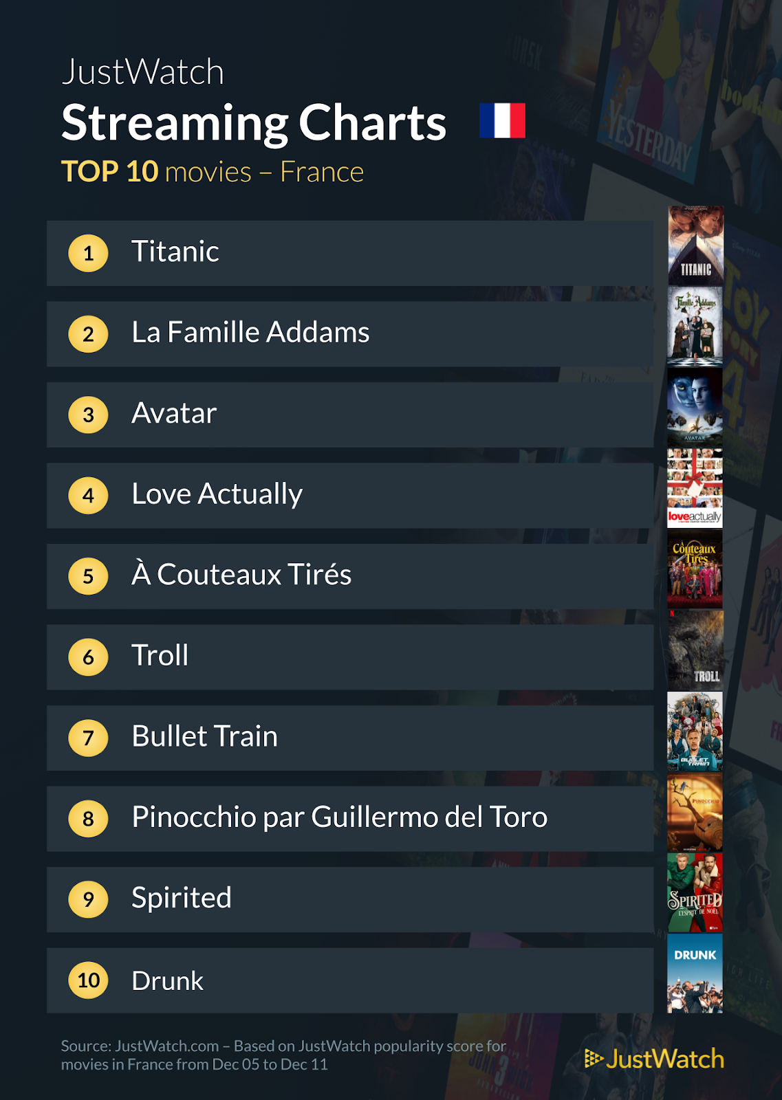 On retrouve ainsi "Titanic", le film culte de 1997 réalisé par James Cameron avec Leonardo DiCaprio et Kate Winslet disponible sur les plateformes payantes à la première place. Suit ensuite le film "La Famille Adams" avec Christina Ricci sur myCANAL et Paramount+ et sur la dernière marche du podium on retrouve "Avatar" accessible sur Disney+.