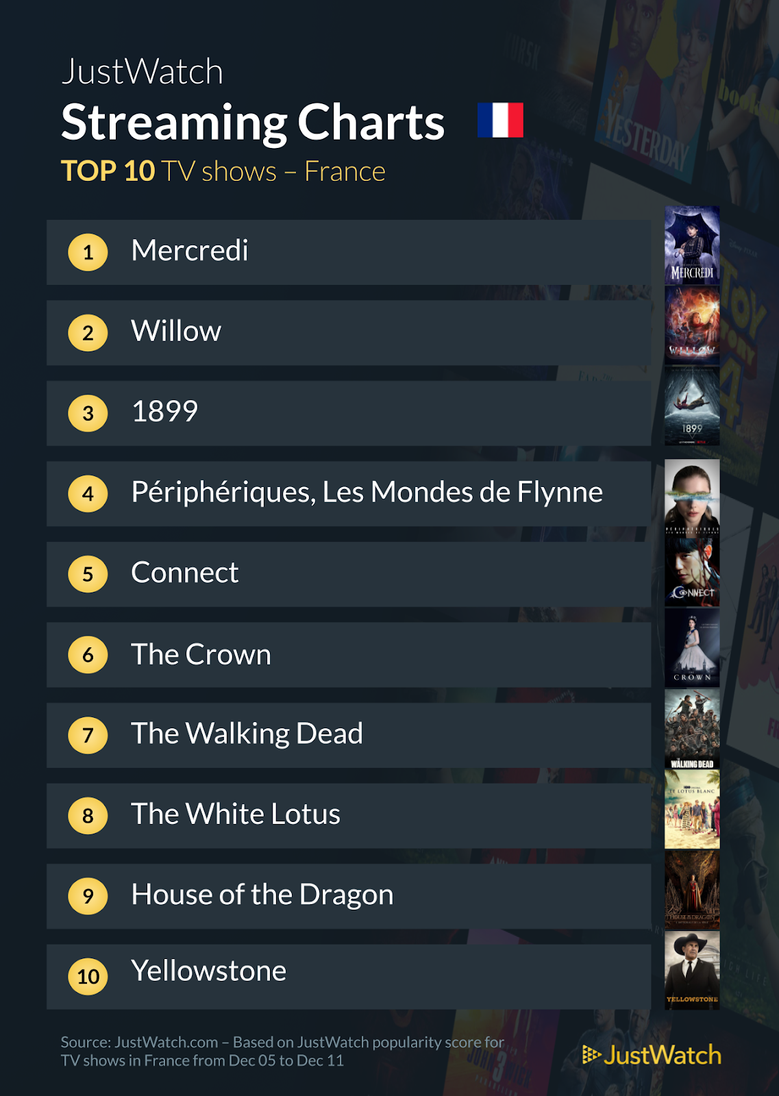 Du côté des séries, on retrouve ainsi à la première place, l'incontournable "Mercredi", la série phénomène de Netflix de Tim Burton avec Jena Ortega suit ensuite "Willow" mis en ligne sur Disney+ et enfin à la troisième place on retrouve "1899" accessible aussi sur Netflix.