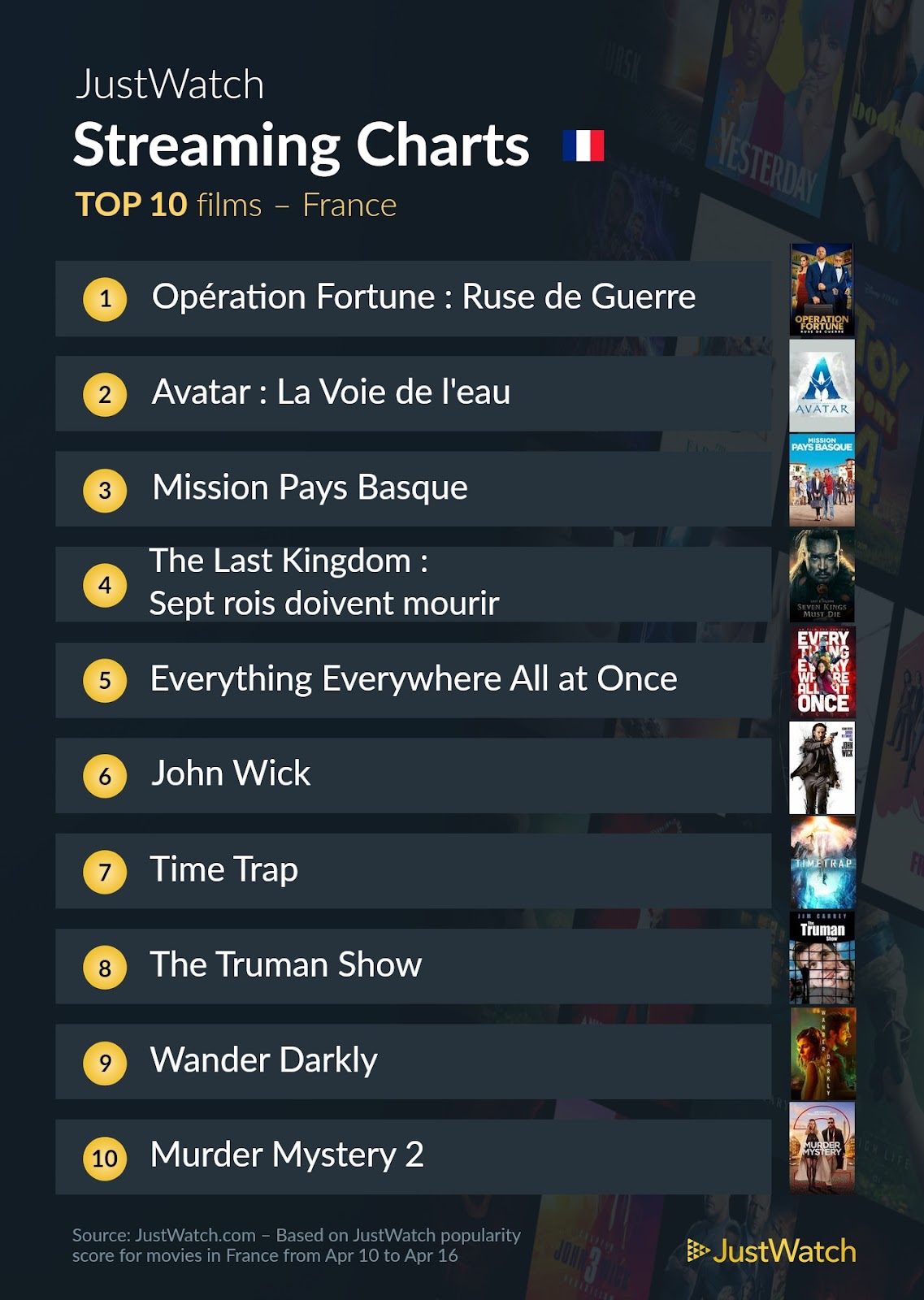 On retrouve "Opération Fortune : Ruse de Guerre", avec Jason Statham, Aubrey Plaza, Josh Hartnett à la première place, actuellement disponible sur Prime Video. Suit ensuite le film "Avatar : La Voie de l'eau" trouvable en VOD sur les plateformes payantes et sur la dernière marche du podium on retrouve "Mission Pays Basque" avec Florent Peyre et Élodie Fontan, actuellement sur Netflix.