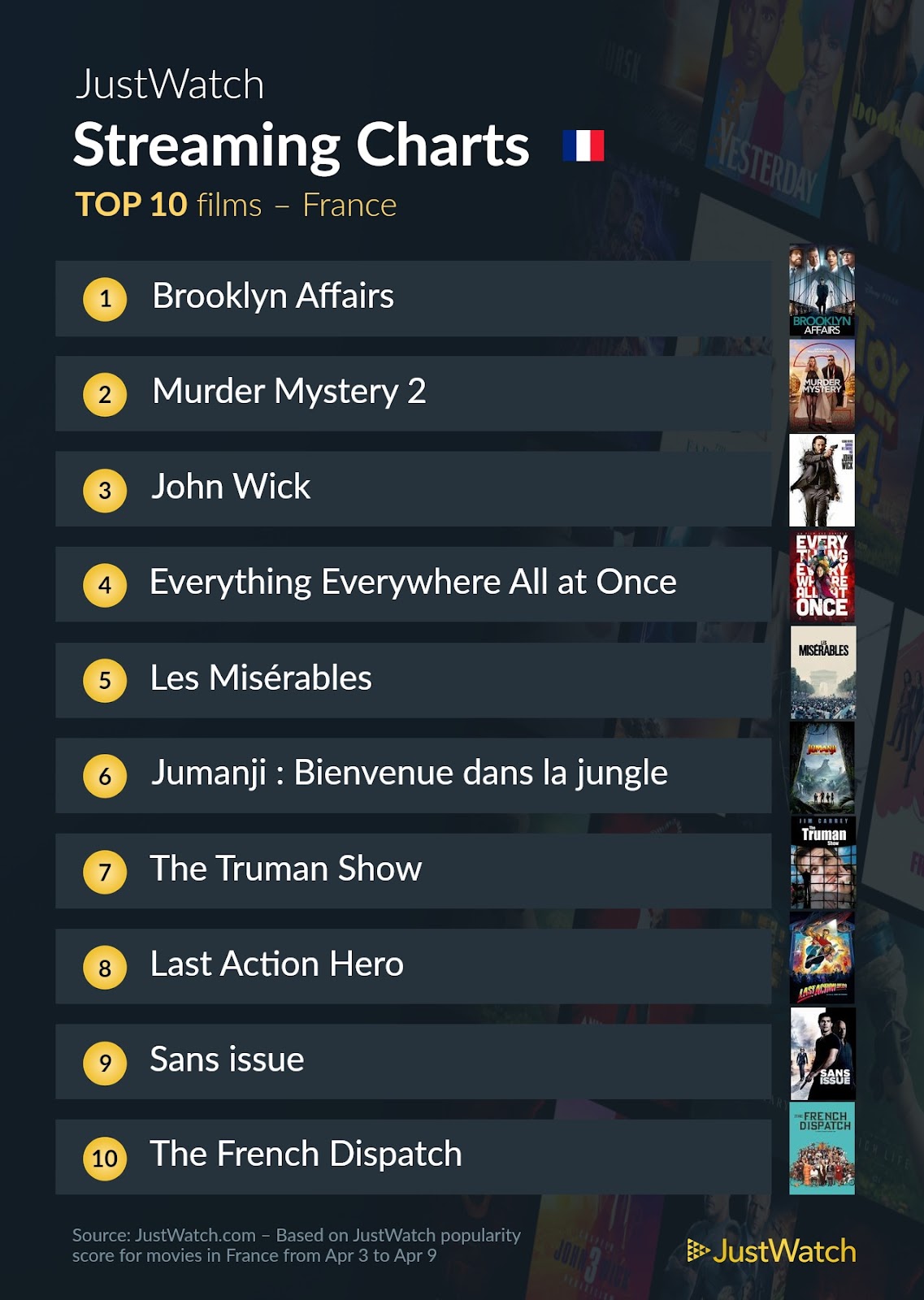 Le site partenaire JustWatch a répertorié les contenus les plus populaires en France sur les différentes plateformes de streaming (Netflix, myCANAL, Prime Video...) du 3 au 9 avril 2023.