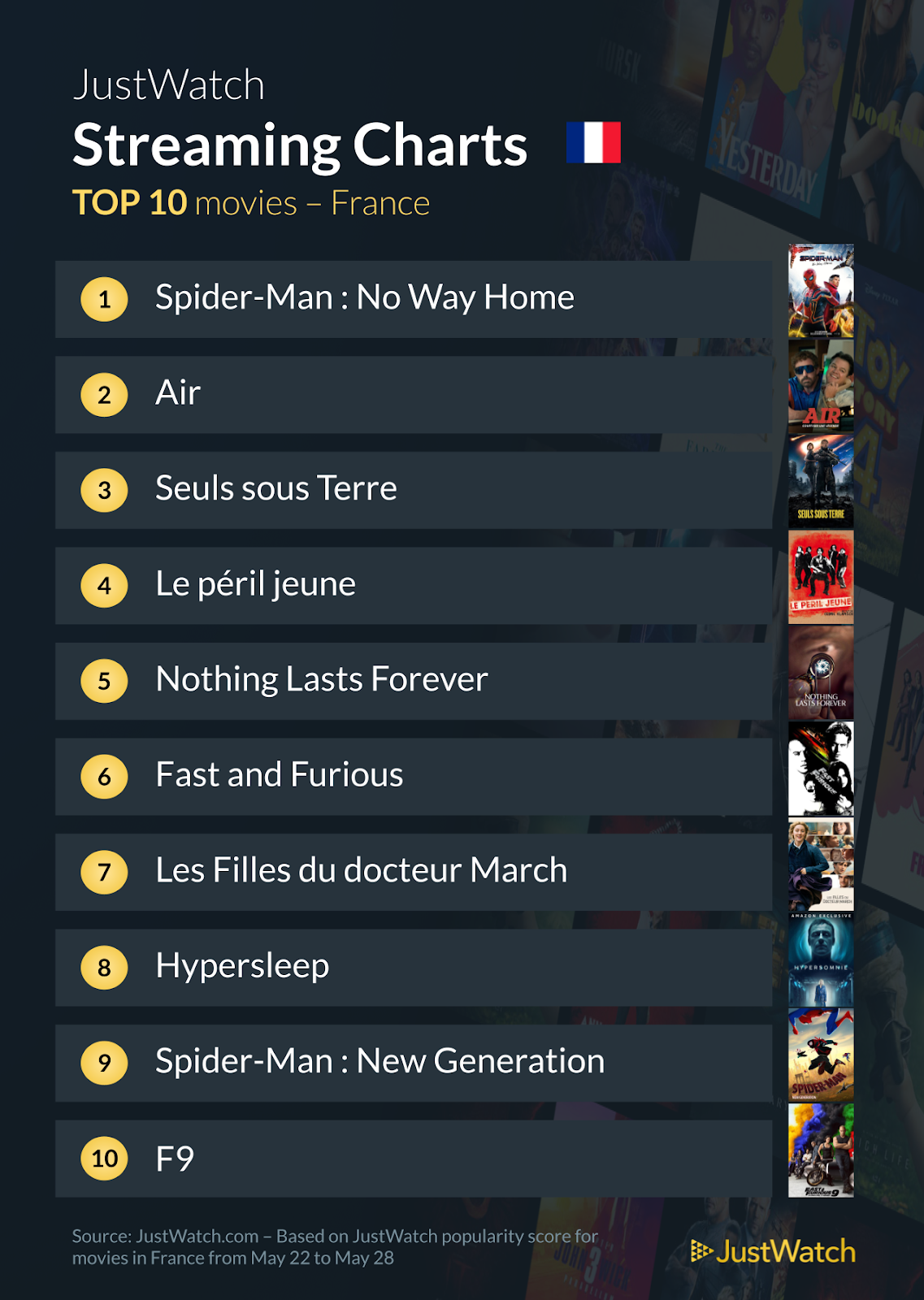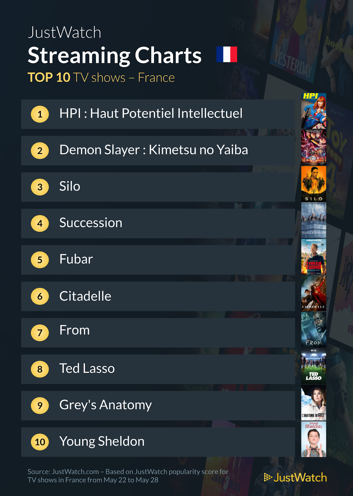 Le site partenaire JustWatch a répertorié les contenus les plus populaires en France sur les différentes plateformes de streaming (Netflix, myCANAL, Prime Video...) du 22 au 28 mai 2023.