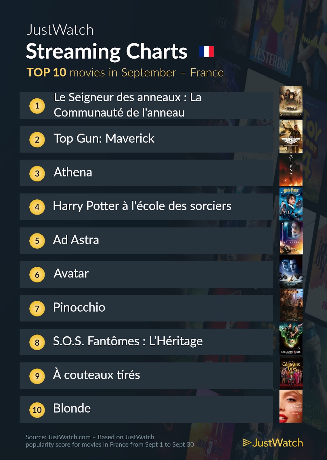 On retrouve ainsi à la première place, le film "Le Seigneur des Anneaux : la communauté de l'anneau" disponible sur Prime Video suivi du film "Top Gun : Maverick" avec Tom Cruise et sur la dernière marche du podium "Athena" issu de la plateforme Netflix.
