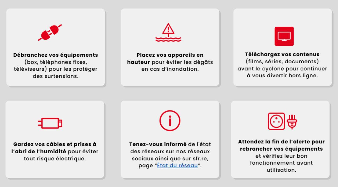 SFR Réunion apporte tout son soutien à la population réunionnaise et s'engage à travailler sans relâche pour le maintien des communications, essentielles à la vie quotidienne de chacun.