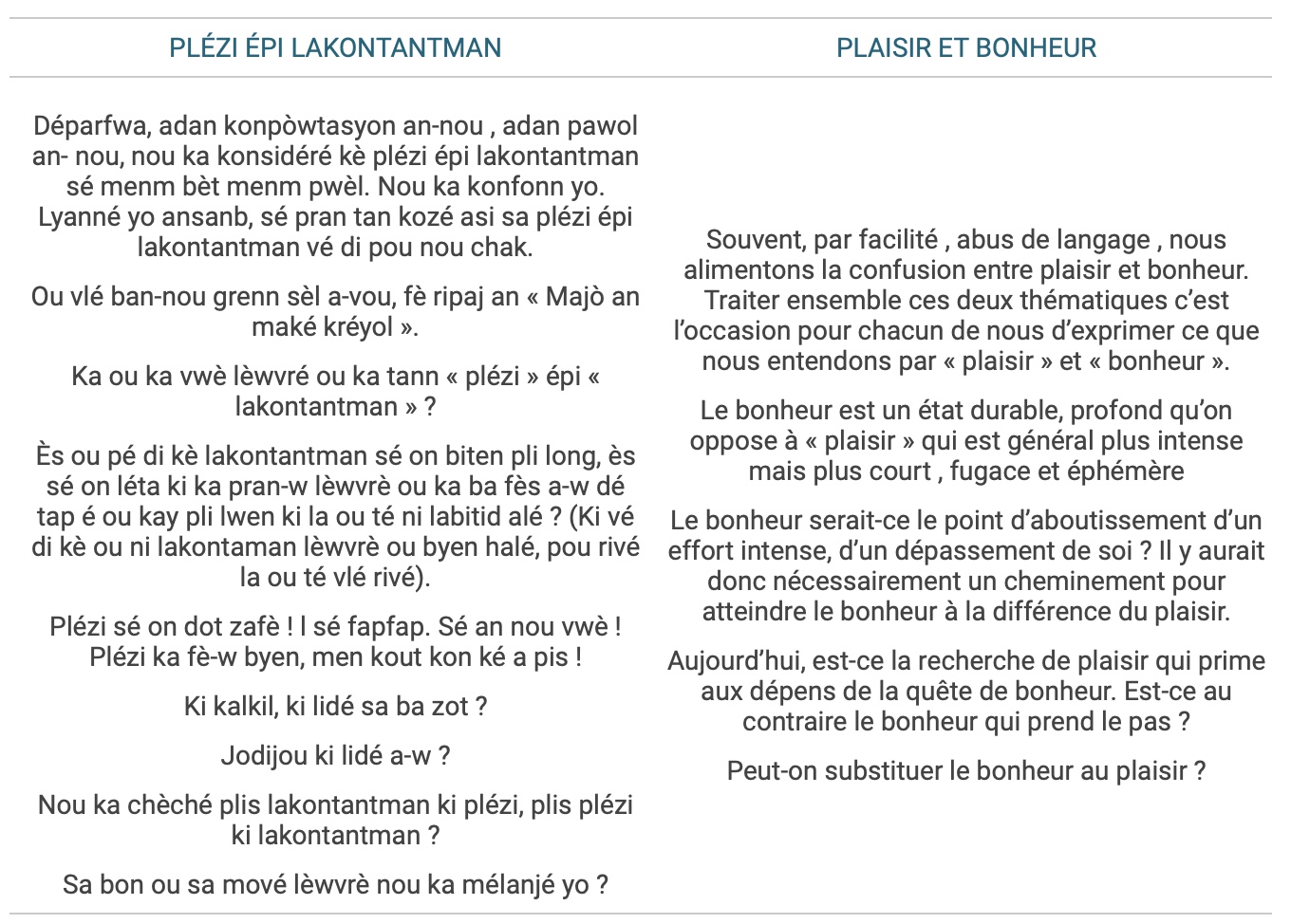 Le prix « Majò an maké Kréyòl » est un concours littéraire de nouvelles, contes et poésies en créole guadeloupéen, de libre créativité, avec pour thème « Plézi épi lakontantman » :