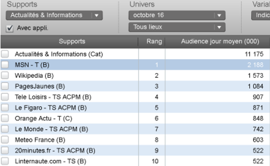 MSN domine le classement de la catégorie sur ce critère avec le double de l’audience journalière de son premier concurrent « avec publicité ». Cet écart continue de s'accroître, et pour cause, l’audience journalière moyenne de la catégorie « Actualités & Informations » a chuté de -5 % au cours de la dernière année, ce qui contraste avec la progression + 42 % enregistrée par MSN.