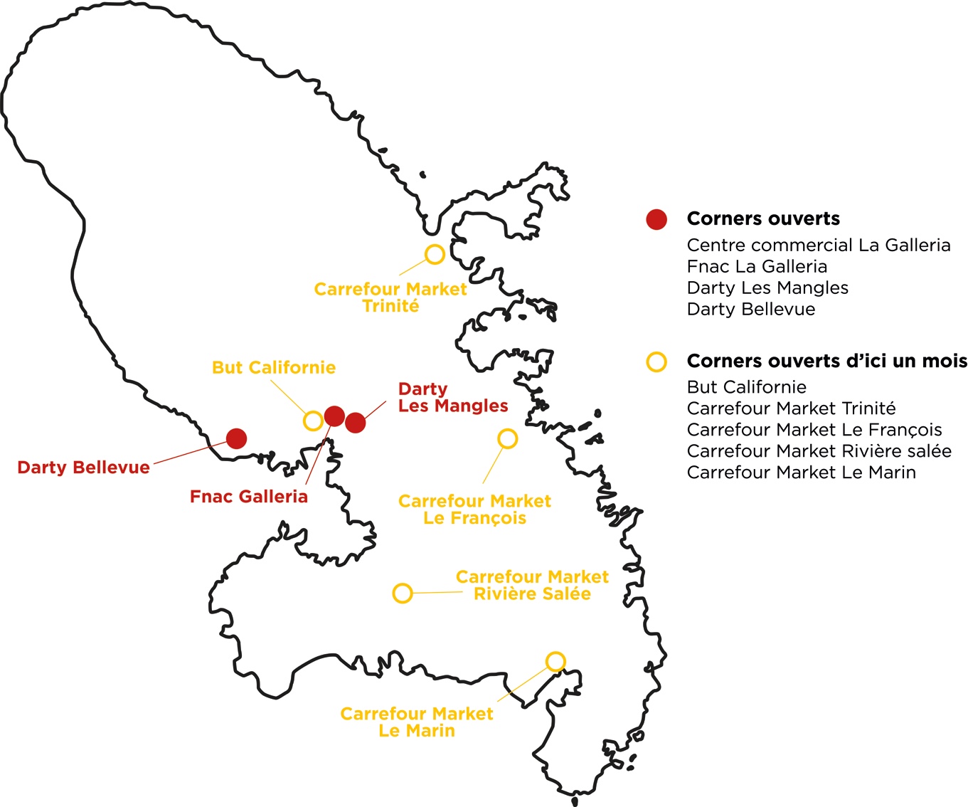 Dotée d’un écran tactile, la borne interactive permet de souscrire simplement au Forfait Free Caraïbe. En trois minutes, l’utilisateur se voit délivrer sa carte SIM activée et utilisable immédiatement. 11 bornes seront disponibles sur l’île de la Martinique le jour du lancement de l’offre Free Caraïbe. 6 autres seront déployées dans le mois qui suit. La future boutique Free disposera aussi de bornes interactives.