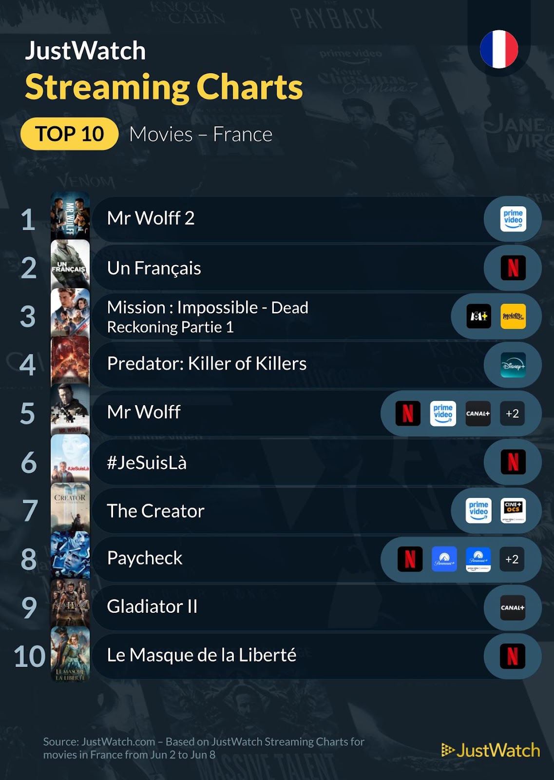 Le site partenaire JustWatch a répertorié les contenus les plus populaires en France sur les différentes plateformes de streaming (Netflix, myCANAL, Prime Video...) du 2 au 8 juin 2025.