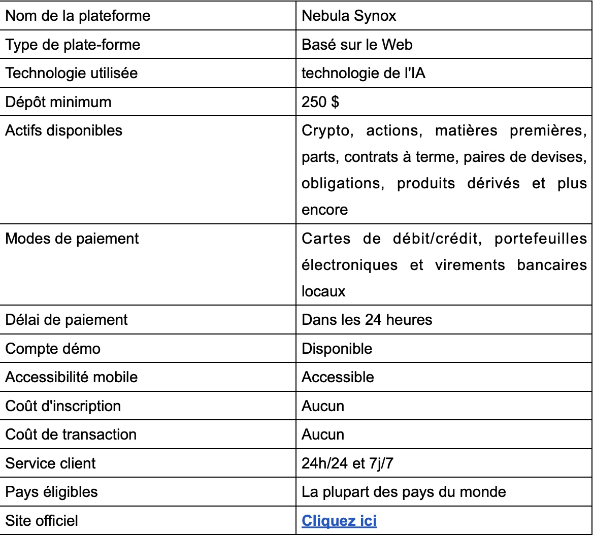 La plateforme de trading la plus en vogue actuellement sur le marché est Nebula Synox . Ses créateurs affirment que cette plateforme, grâce à ses fonctionnalités avancées, répondra aux besoins des experts comme des débutants. Aujourd'hui, cette revue Nebula Synox propose une analyse approfondie de ce bot de trading afin de vérifier les affirmations de ses fondateurs et de s'assurer de son authenticité. Alors, lancez-vous sans plus attendre !