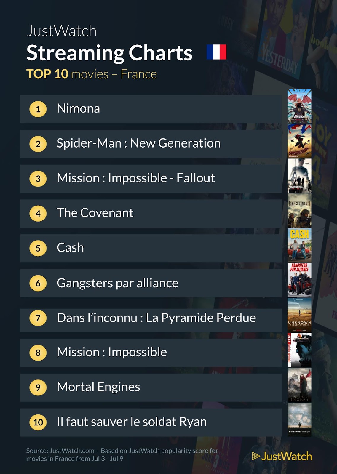 On retrouve ainsi le film d'animation "Nimona" disponible sur Netflix à la première place suivi d'un autre film d'animation "Spider-Man : New Génération" accessible sur Disney+ et sur la dernière marche du podium on retrouve "Mission Impossible : Fallout" trouvable sur Canal+.
