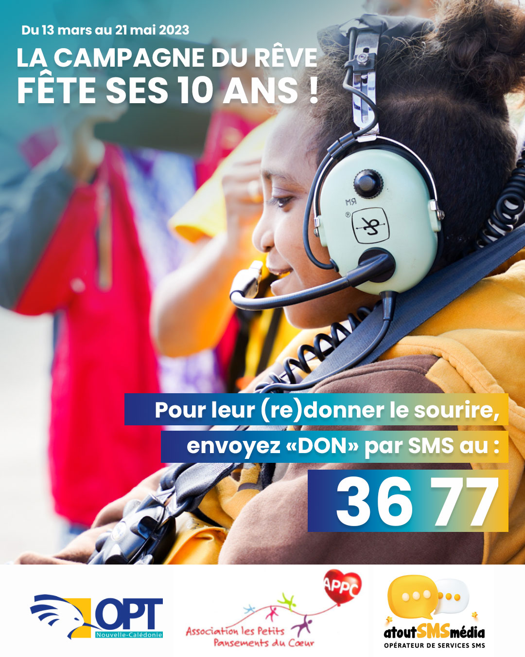 L’Association des Petits Pansements du Cœur (APPC), en partenariat avec l’OPT-NC et Atout SMS Média (ASM) lance la 10e édition de sa Campagne du Rêve, au profit des enfants malades chroniques suivis au Médipôle. A vos smartphones !