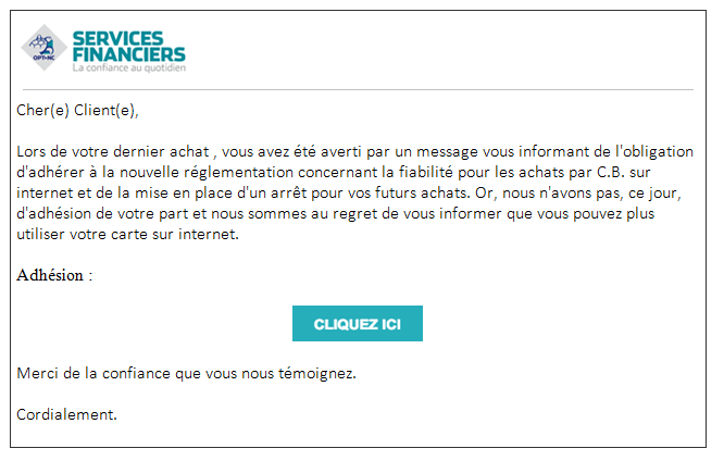 Un lien contenu dans l'email renvoie vers un lien afin de dérober des renseignements confidentiels sur l'internaute piégé.