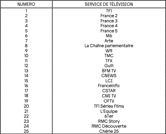 Les autres numéros actuels restent inchangés, afin de minimiser les impacts pour les utilisateurs. Les chaînes principales, telles que TF1, France 2, M6 et autres, conservent leurs emplacements habituels.