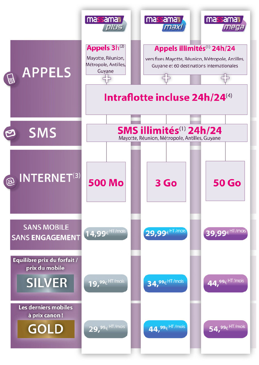 - SMS Illimités 24h/24 vers mobiles Mayotte, Réunion, Métropole, Antilles, Guyane